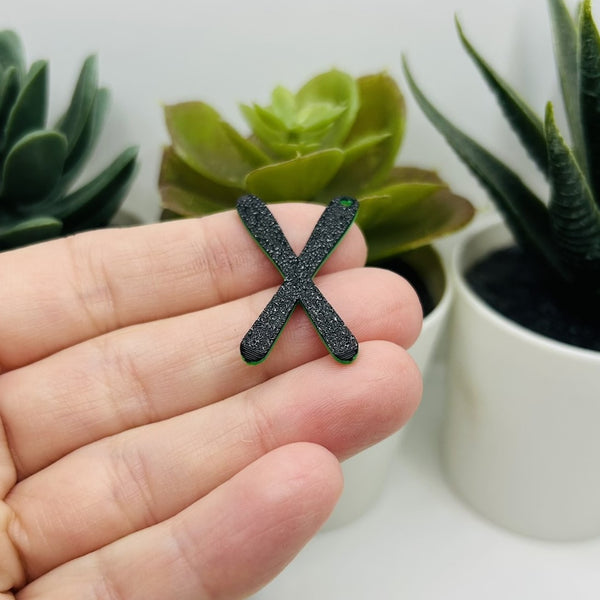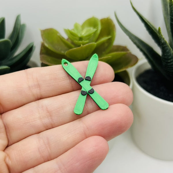 Miniature 3D ski charms featuring crossed skis in vibrant green. Each charm measures 32x20 mm, making them perfect for jewelry projects, bracelet embellishments, or charm collections. Crafted with fine detail, these playful winter-themed pieces add a sporty touch to any design. Ideal for ski enthusiasts and winter lovers.