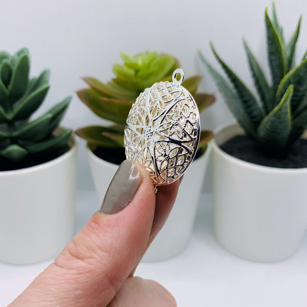 Feel the aromatherapy vibes with these stunning silver plated filigree diffuser lockets! Choose 4, 20, or 50 pieces to upgrade your style, plus get the benefit of relieving stress and setting the mood with essential oils. The perfect lock-and-key to your relaxation!
