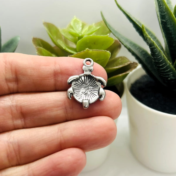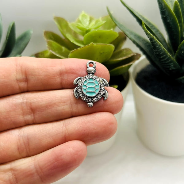 These silver-tone turtle charms feature a detailed sea turtle design with a turquoise-style enamel shell and a sparkling rhinestone border. Each charm includes a top loop for easy attachment, making them ideal for bracelets, necklaces, earrings, keychains, and coastal-themed craft projects. Sold in packs of 4.