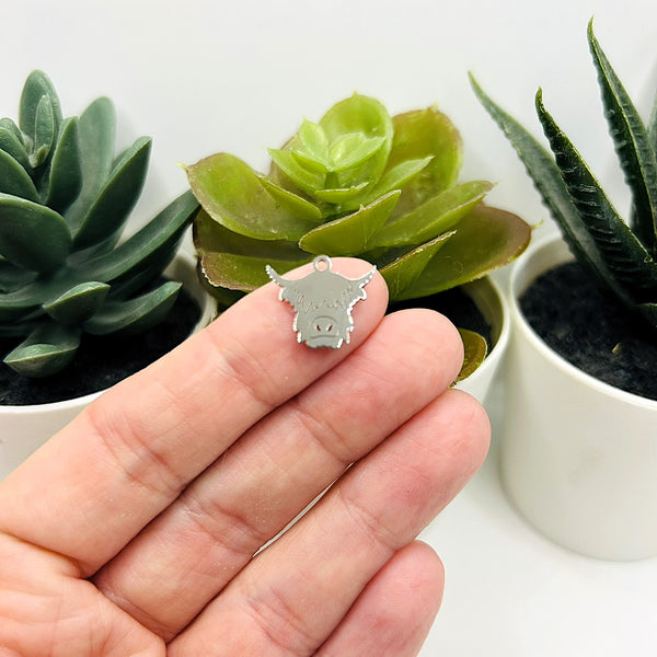 Crafted from durable stainless steel, these 14x15mm Highland cow charms offer both strength and detailed design. Ideal for jewelry making or personalized crafts, their corrosion-resistant finish ensures long-lasting wear. Available in 1, 4, or 20 pieces.