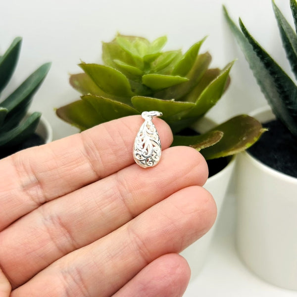 These sterling silver filigree charms measure 17x8mm, offering a delicate and refined accent for your jewelry creations.